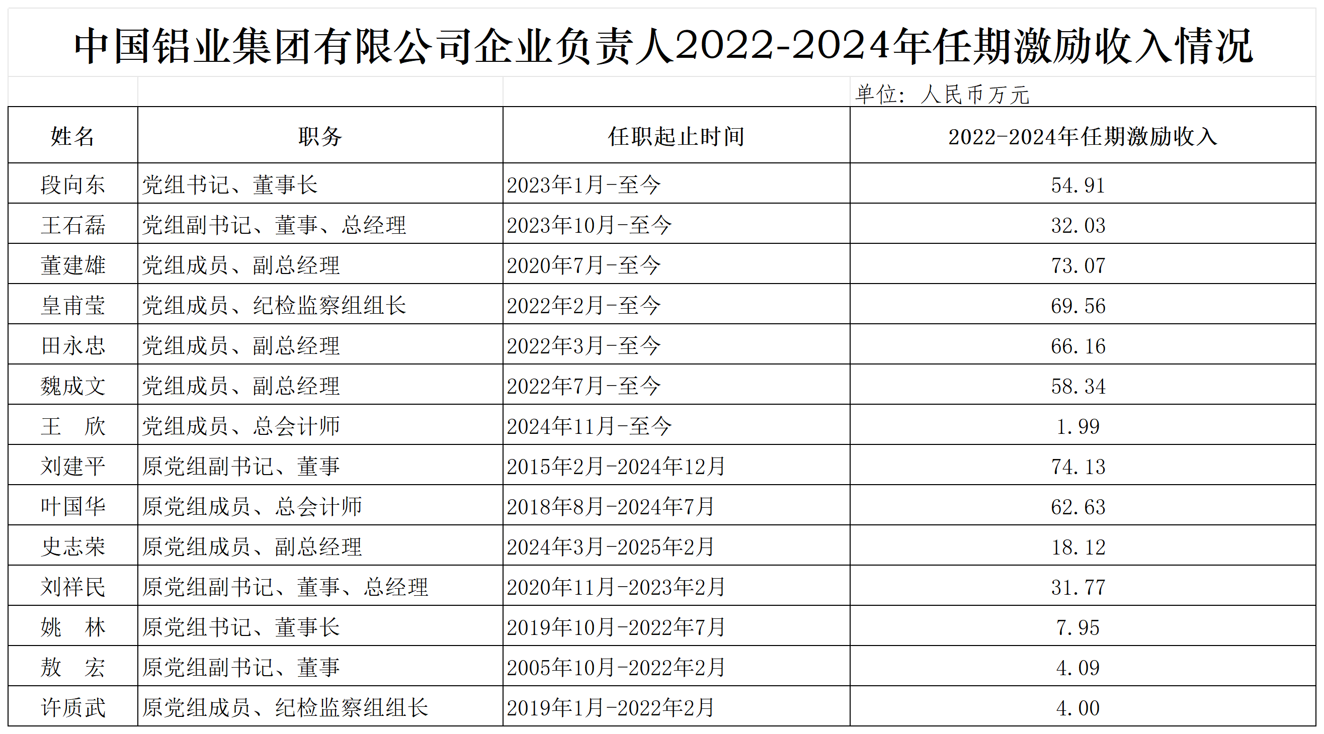 中国铝业集团有限公司企业负责人2022-2024年任期激励收入情况